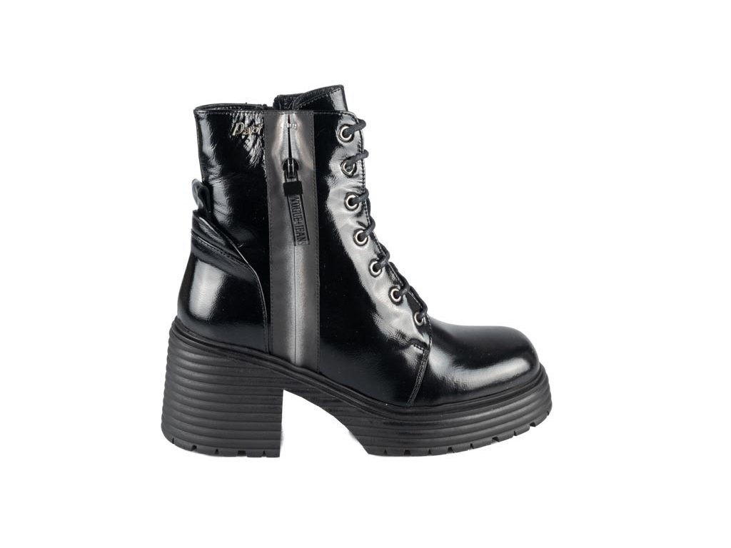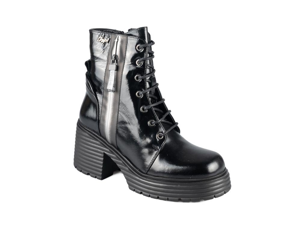 Moderní a neokoukaná je tato kožená kotníková lakovaná obuv v klasické a nestárnoucí černé barvě, která podtrhne váš podzimní outfit. Výrazným detailem je černo stříbrný pruh s ozdobným zipem, který botě dodává na originalitě. Stabilní špalíkový podpatek jen podtrhuje celkový moderní vzhled boty. Obuv je vhodná pro chodidlo typu F.