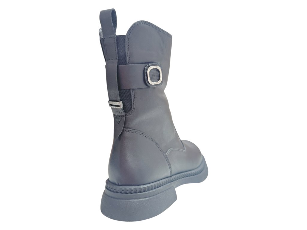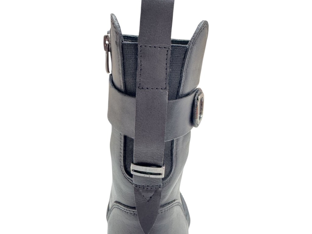 Zadní část obuvi zdobí decentní kožený pásek s kovovou sponou, pod kterým je vsazená pružinka – ta zajišťuje pohodlný pohyb lýtka při chůzi a eliminuje tlak při nazouvání.