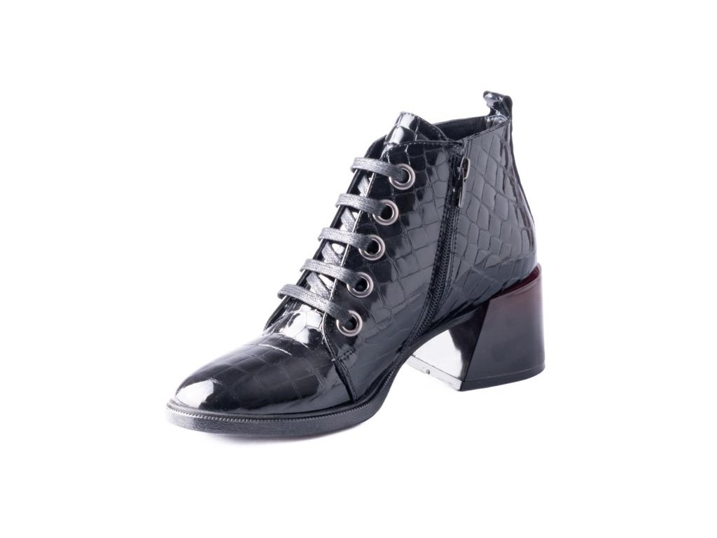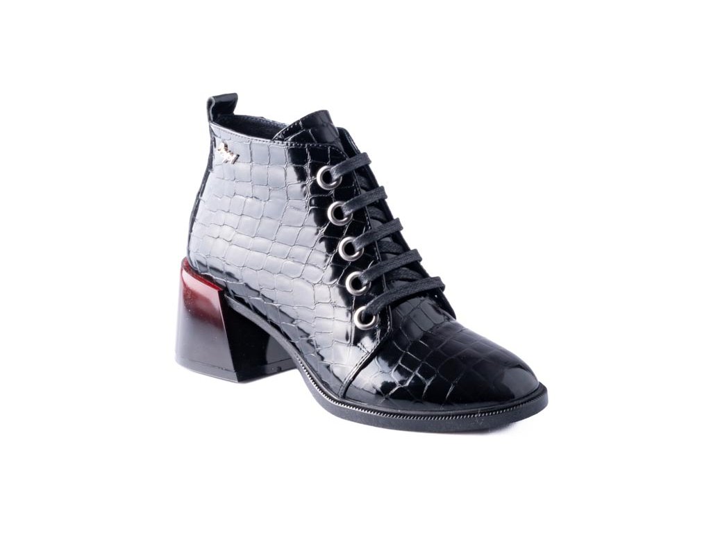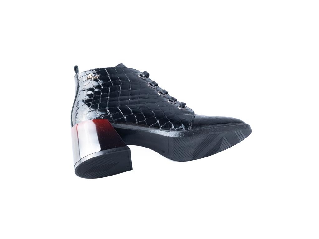 Ikonický černý kroko lakovaný kotník s luxusním podpatkem. Tento model je skutečným bestsellerem, který vyniká nejen svým elegantním designem, ale také jedinečnými detaily. Černý lakovaný kroko povrch a unikátně zabarvený podpatek, přecházející od tmavě bordo do výrazné bordo, přidává obuvi luxusní nádech a nezaměnitelný vzhled.
