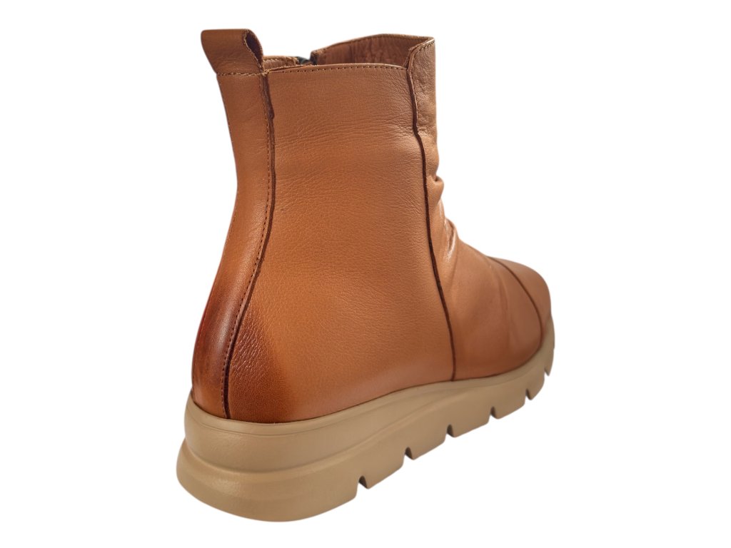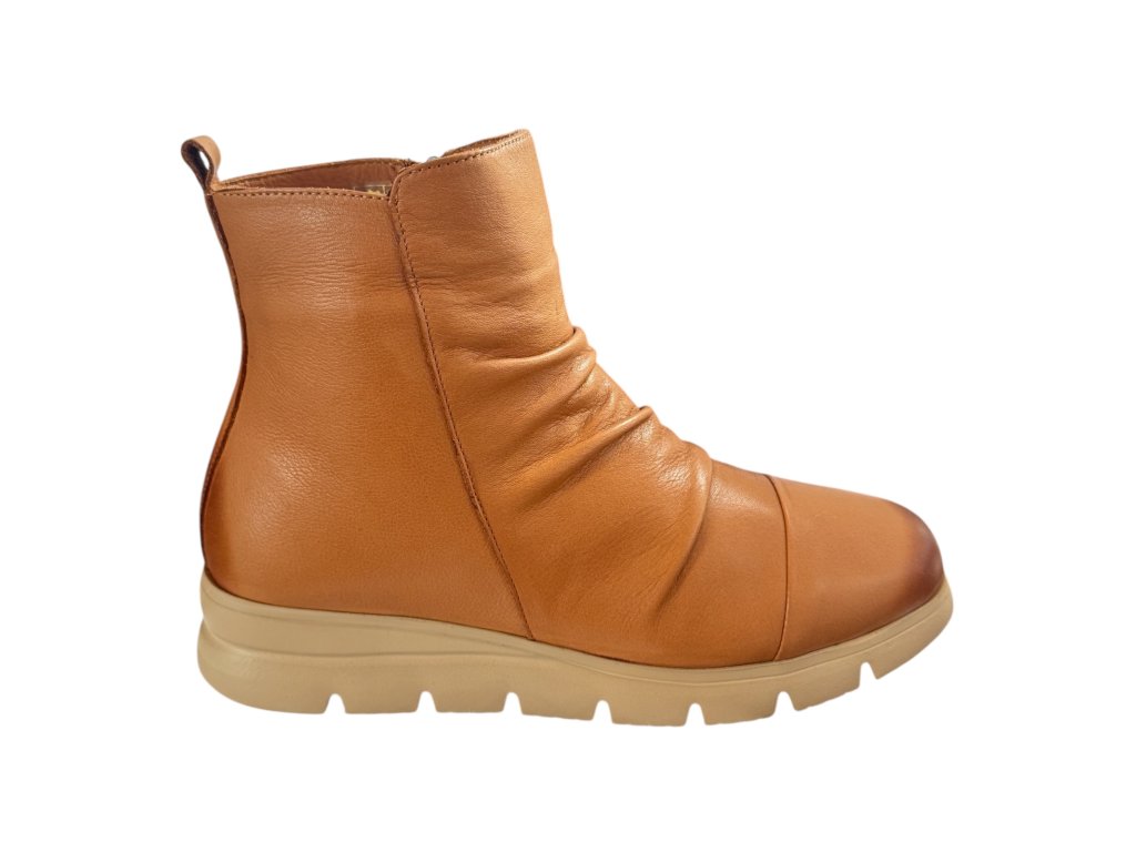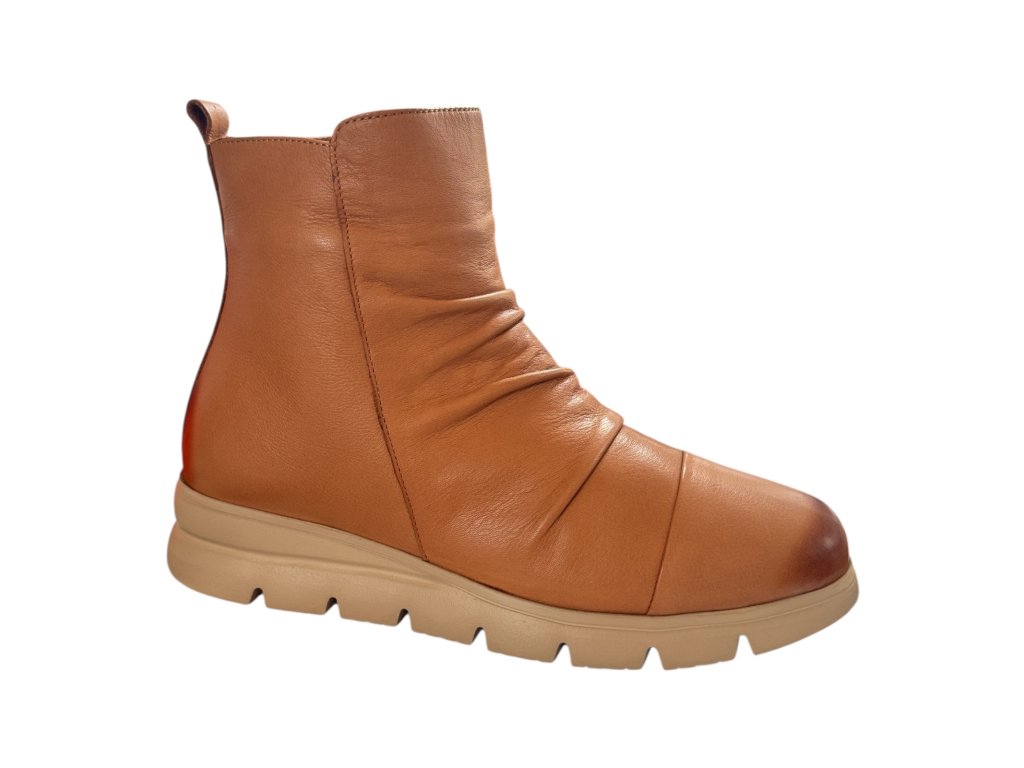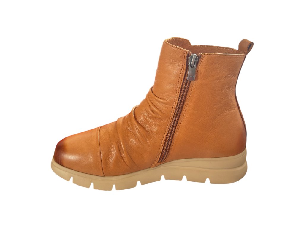 Stylová dámská kotníková obuv v přírodní hnědé barvě působí elegantně a přirozeně. Vyrobena z pravé, jemně zpracované kůže, která se dokonale přizpůsobí tvaru nohy. Jemné řasení na nártu dodává obuvi osobitý charakter a uvolněný styl. Vnitřní zip umožňuje snadné a pohodlné nazouvání.