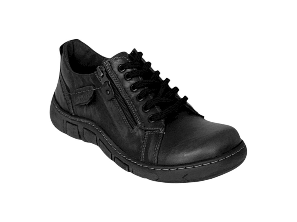 Stylová dámská obuv značky Kacper v tmavě šedém odstínu se stíraným efektem. Kombinace šněrování a bočního zipu zajišťuje nejen originální vzhled, ale také snadné a rychlé obutí. Každý detail, od ozdobného prošití až po jemně stíranou kůži, podtrhuje moderní vzhled této obuvi.
