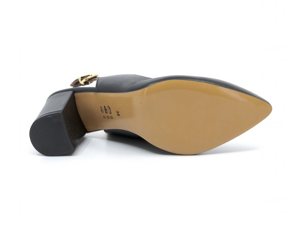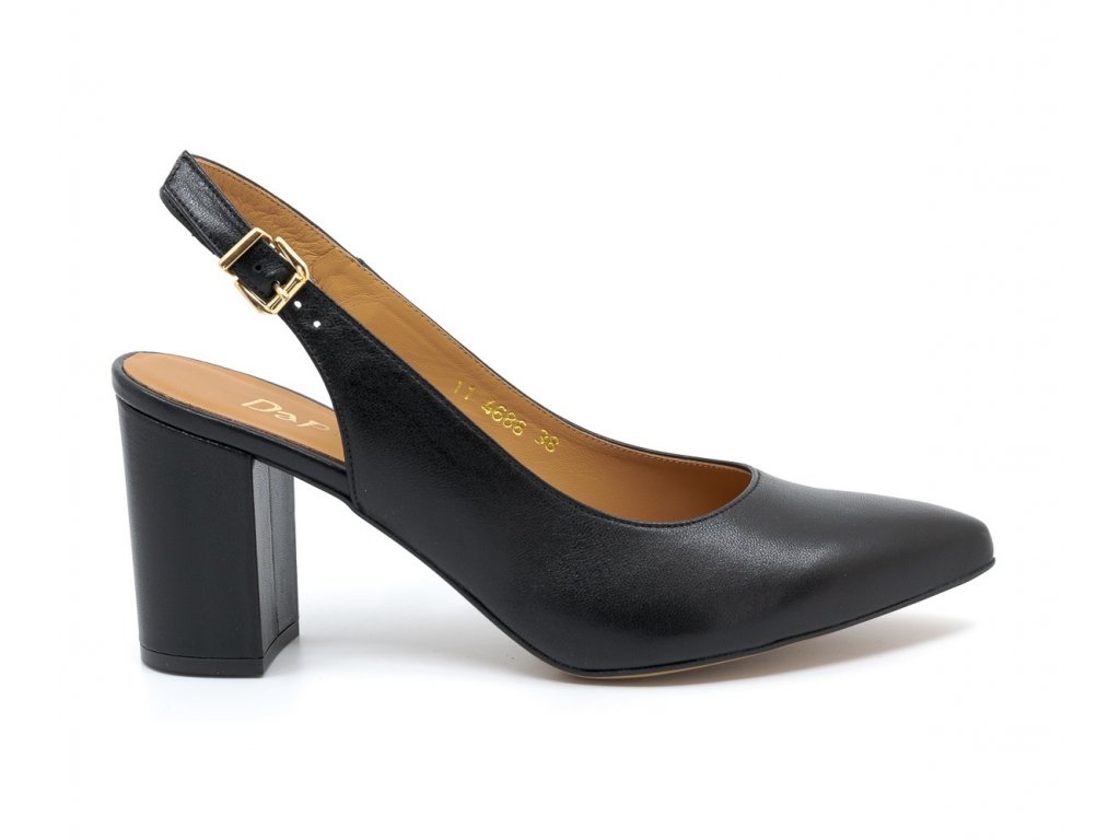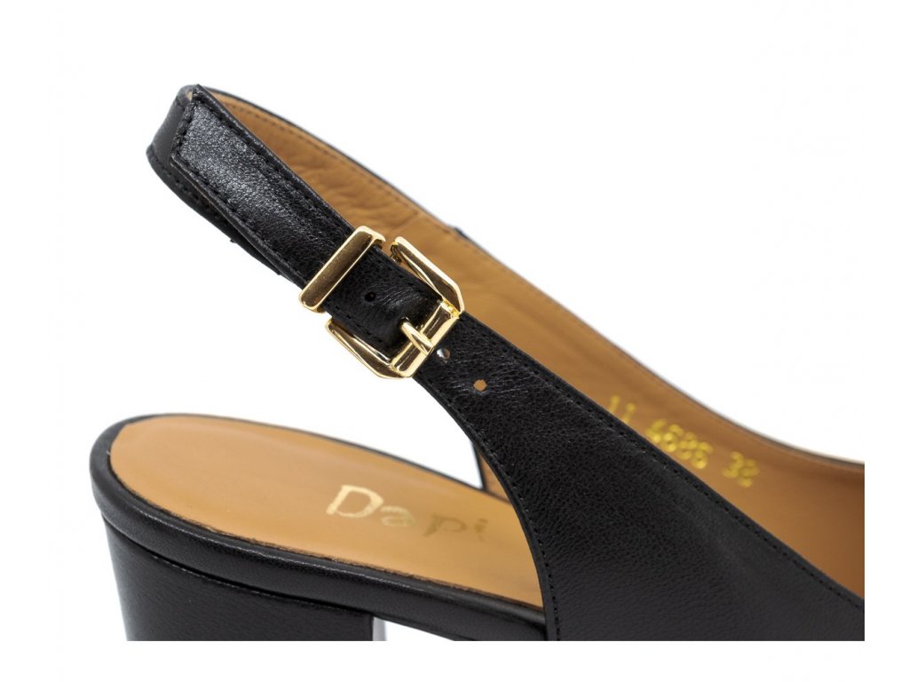 Dámské černé lodičky s otevřenou patou zn. Dapi. Zapínání - zlatá spona. Podešev - hladká. Stélka - kožená, vyměkčená. Podpatek výška - 7,5 cm. Podešev tloušťka - 0,2 mm. Model je vhodný pro chodidla typu F - G.>Doplňkové parametry