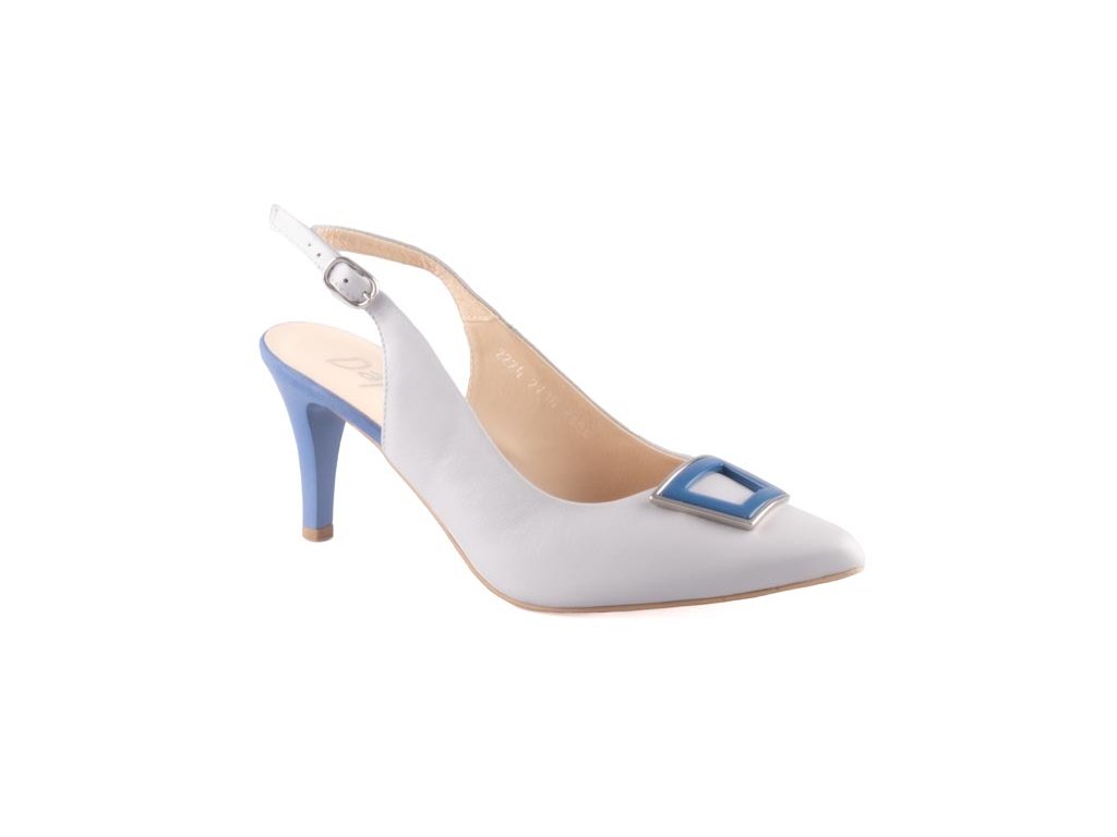 Elegantní dámská lodička s otevřenou patou v sofistikované kombinaci šedé a modré barvy. Decentní barevnost působí luxusně a nadčasově. Dominantním prvkem je výrazná ozdoba na špičce – modrý detail vsazený do stříbrného rámečku, který dodává modelu originalitu. Zadní část doplňuje jemný pásek kolem kotníku s nastavitelným zapínáním pro dokonalé přizpůsobení.