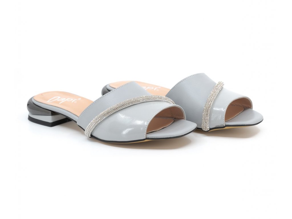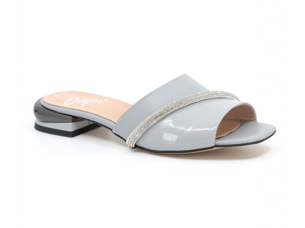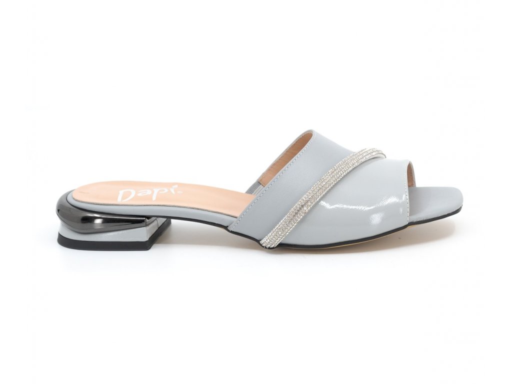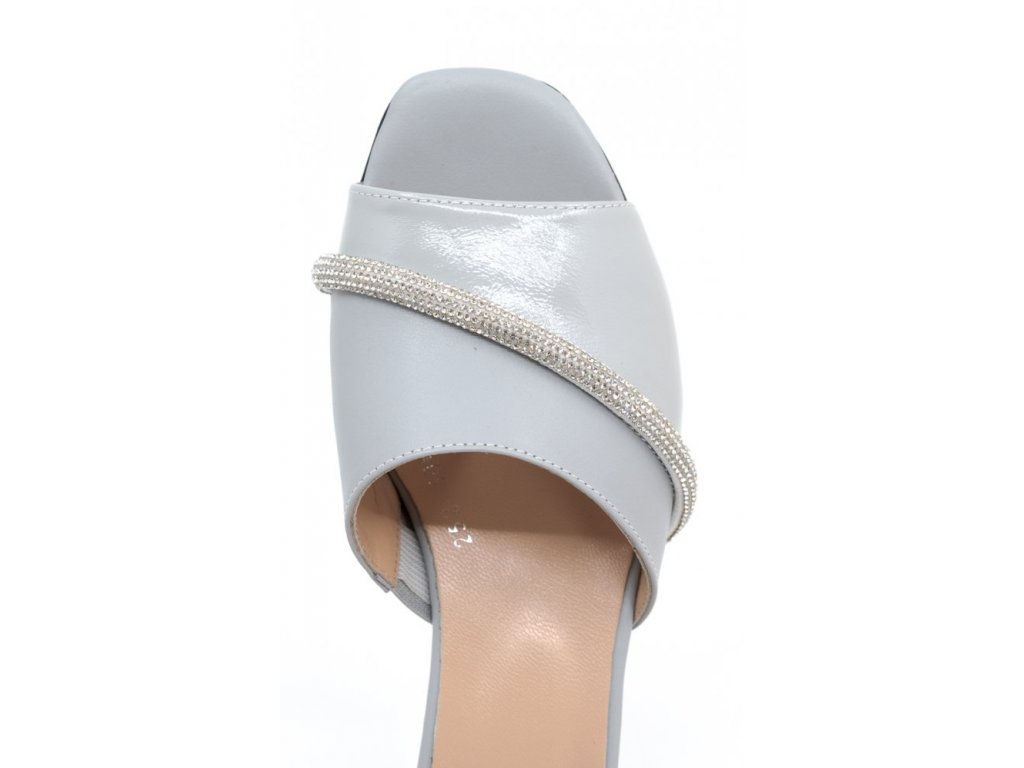 Šedé lakované pantofle s ozdobou na nártu v podpbě hada osázeného kamínky. Stélka kožená, vyměkčená pod patou. Nepřehlédnutelný podpatek o výšce 2 cm. Tloušťka podešve 2 mm. Podešev hladká. Model je vhodný pro chodidla typu F-G.>