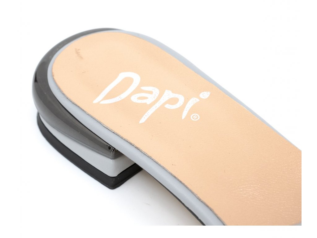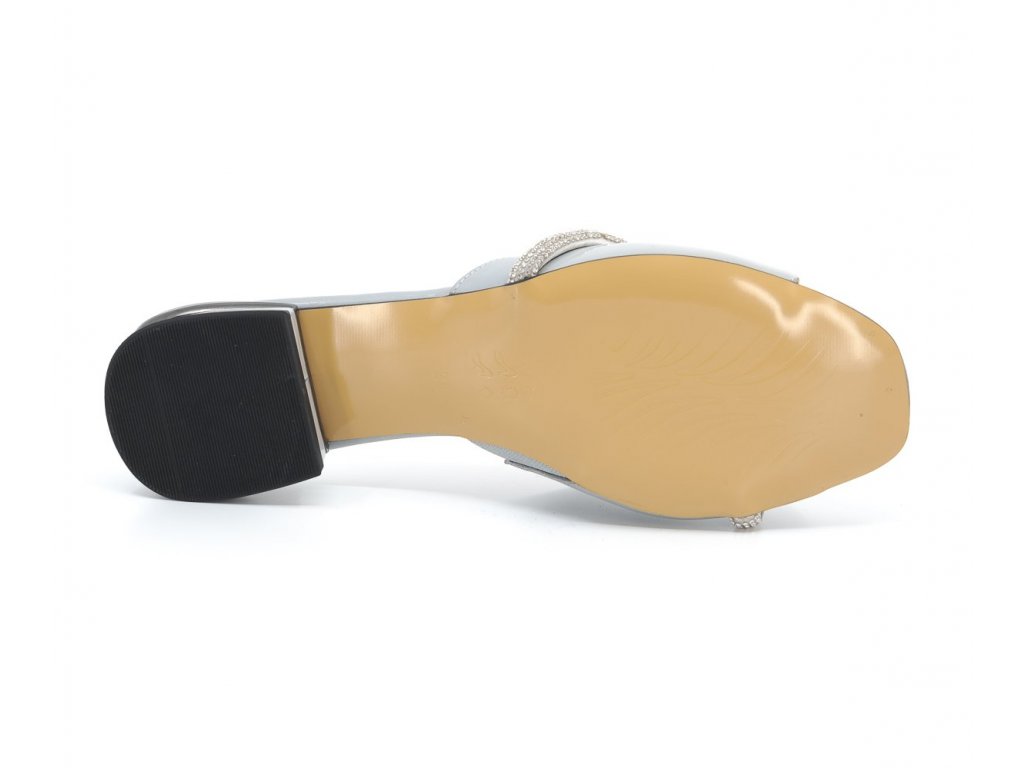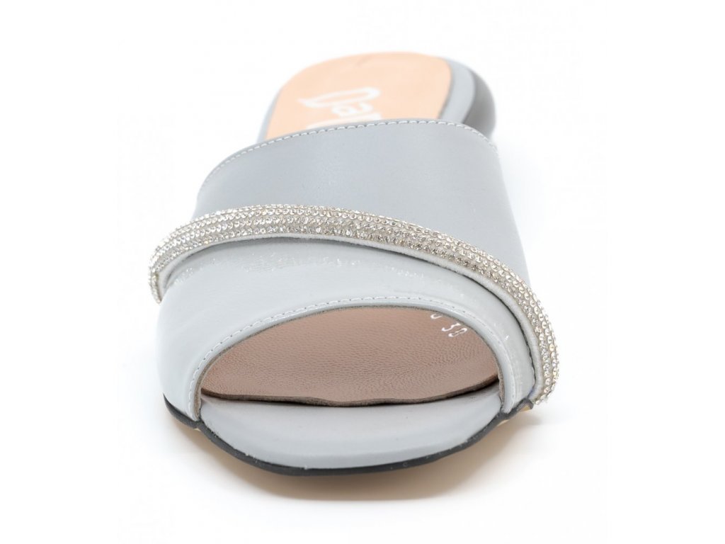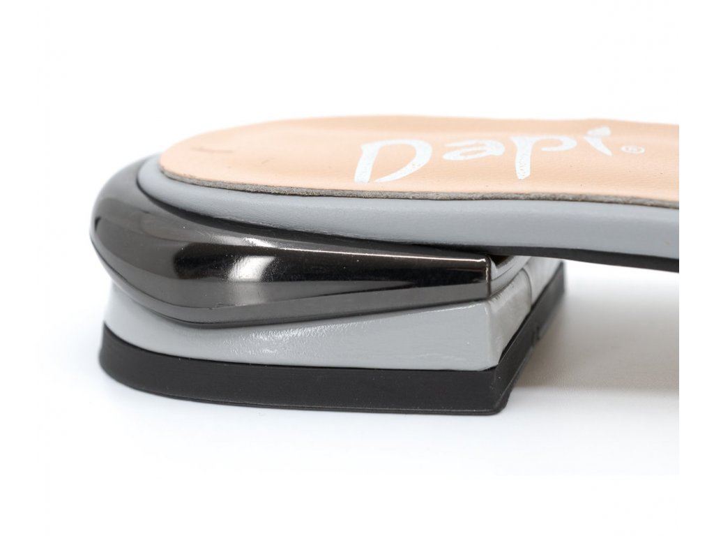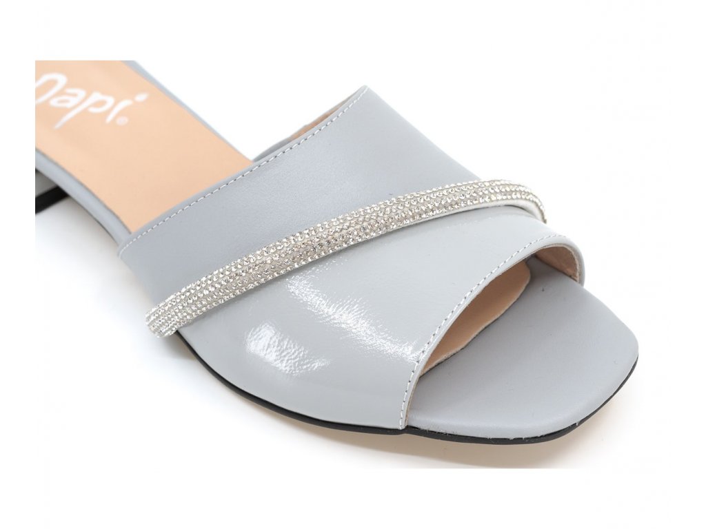 Šedé lakované pantofle s ozdobou na nártu v podpbě hada osázeného kamínky. Stélka kožená, vyměkčená pod patou. Nepřehlédnutelný podpatek o výšce 2 cm. Tloušťka podešve 2 mm. Podešev hladká. Model je vhodný pro chodidla typu F-G.>