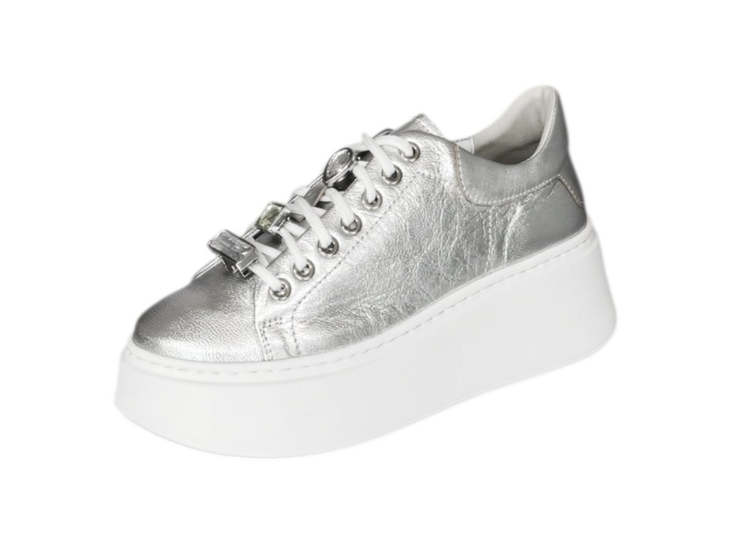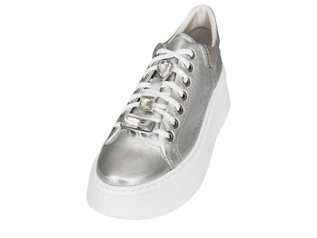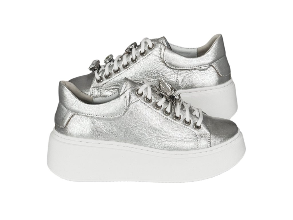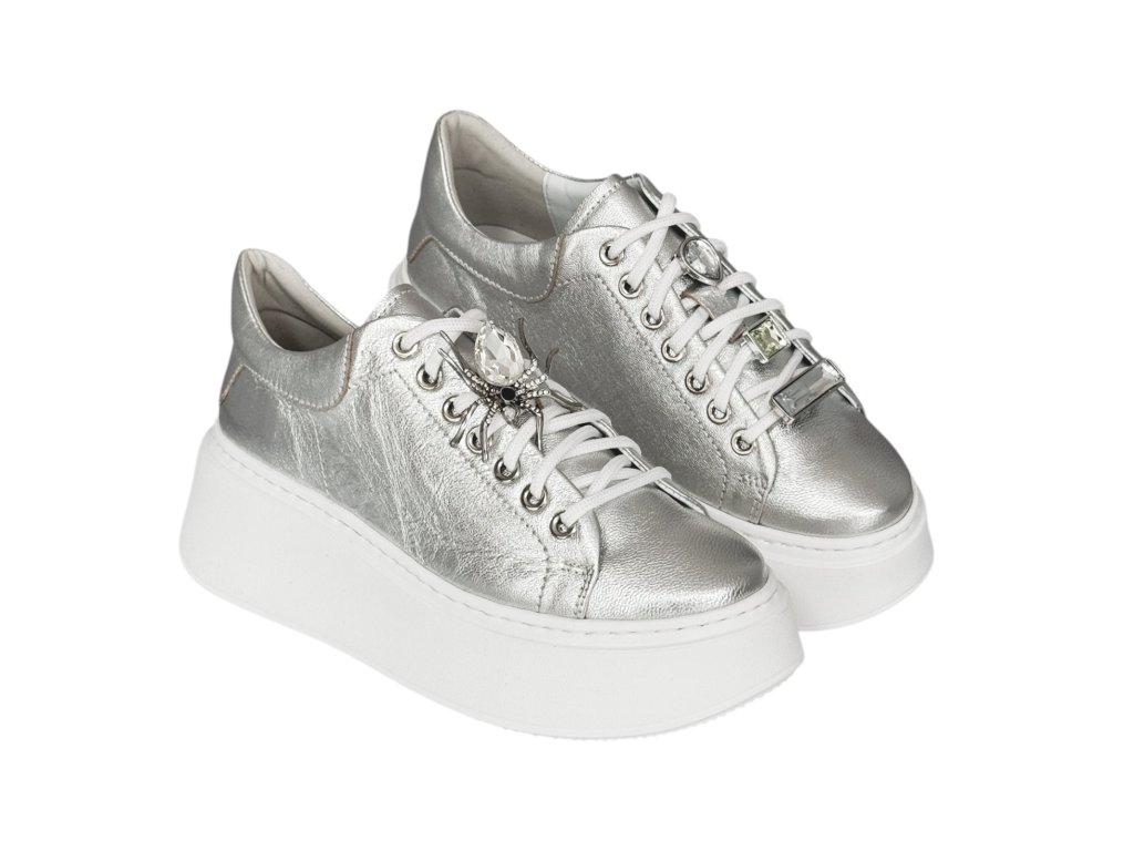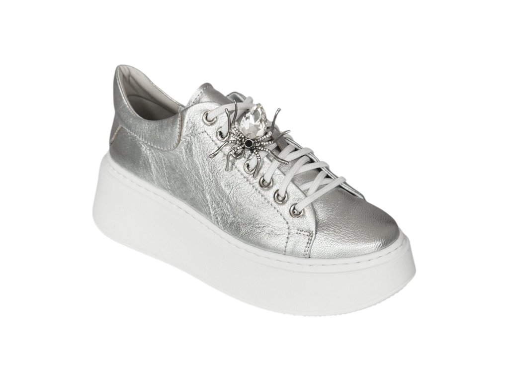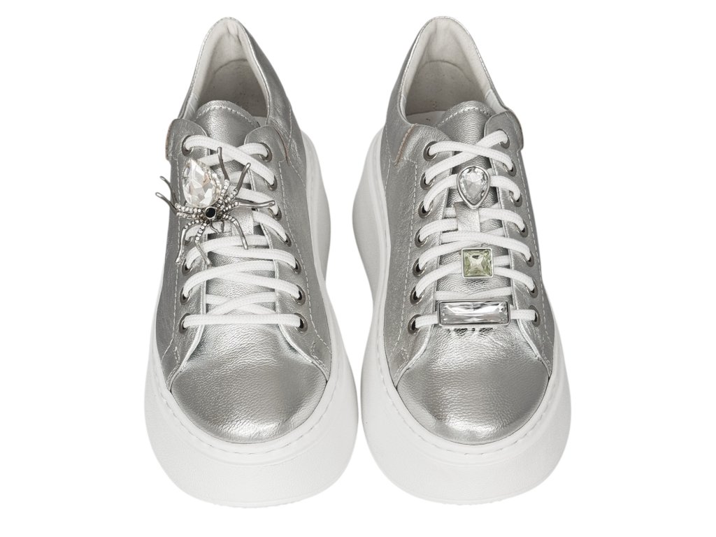 Moderní dámské polobotky Dapi v luxusním stříbrném provedení z měkké pravé kůže působí stylově a nadčasově. Každý pár je originální – pravá obuv zdobená stříbrným pavoukem s kamínky, levá obuv osazena třemi lesklými krystaly.