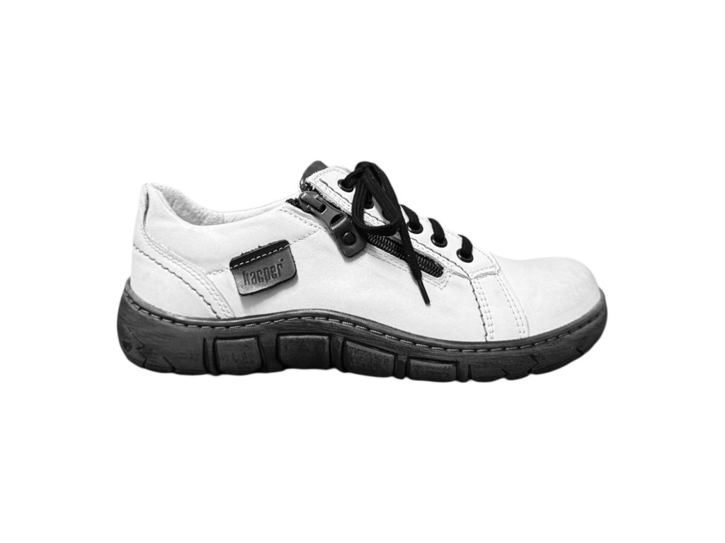Stylová dámská obuv značky Kacper v bílé barvě s kontrastními černými doplňky zaujme svým minimalistickým, a přitom výrazným vzhledem.