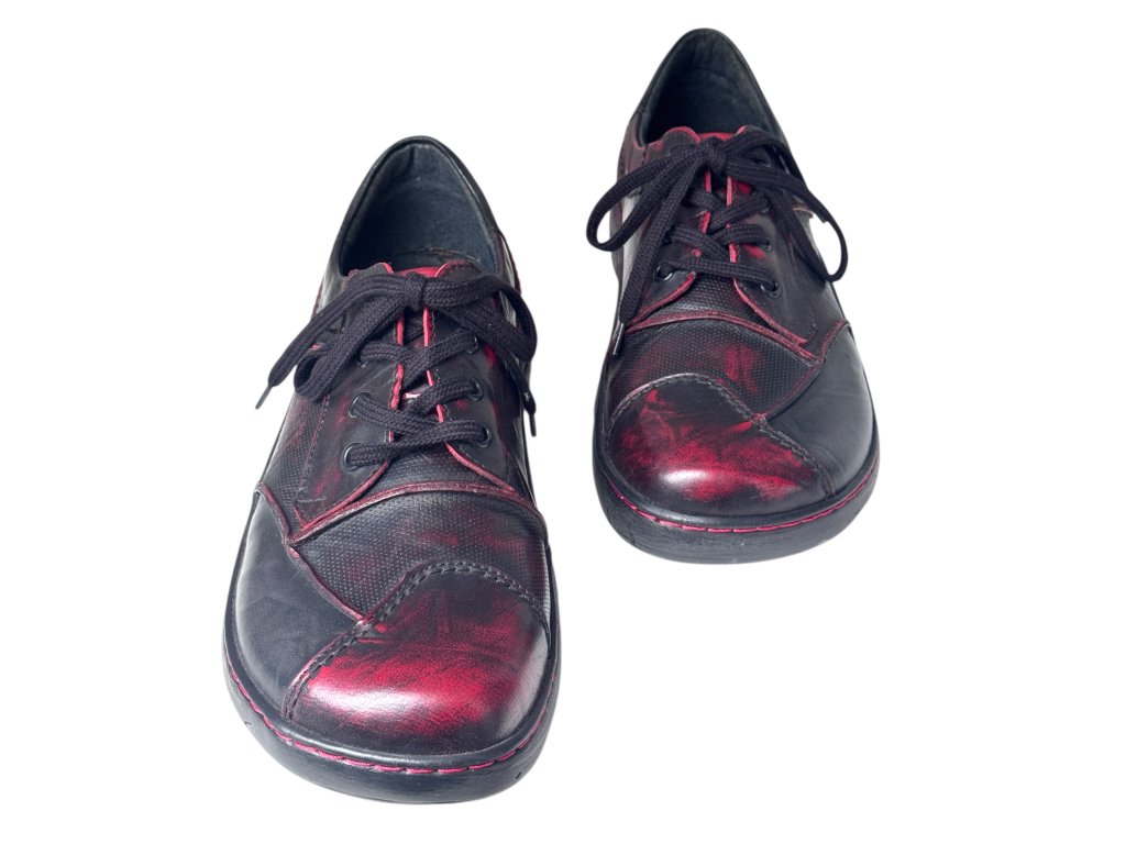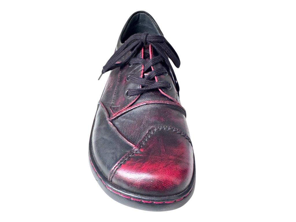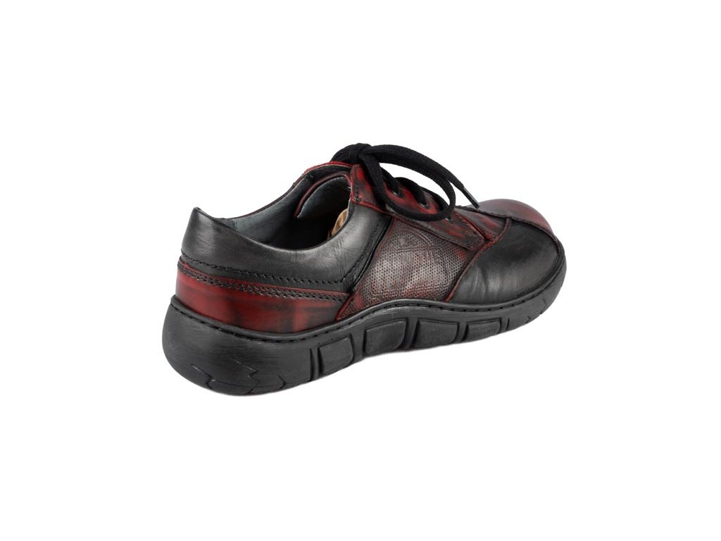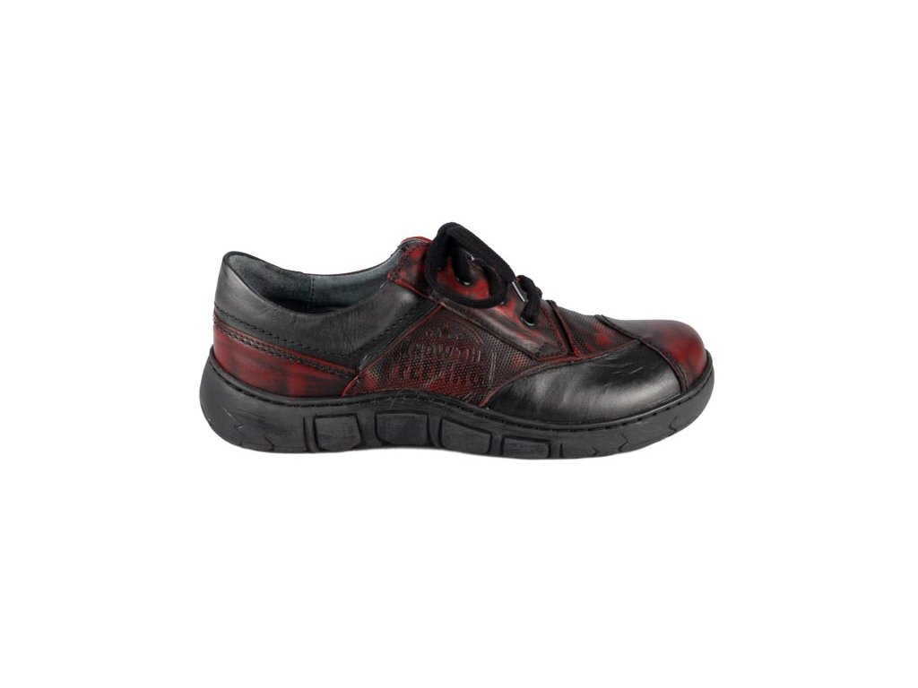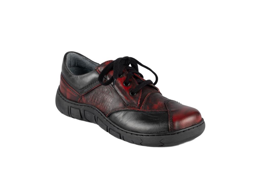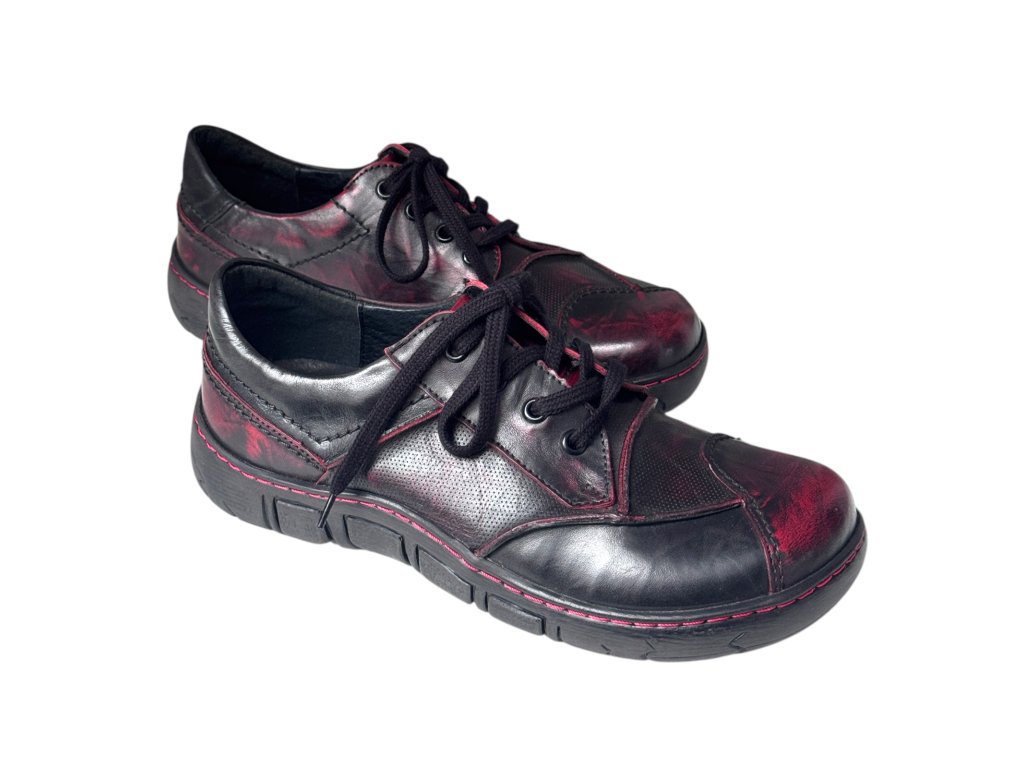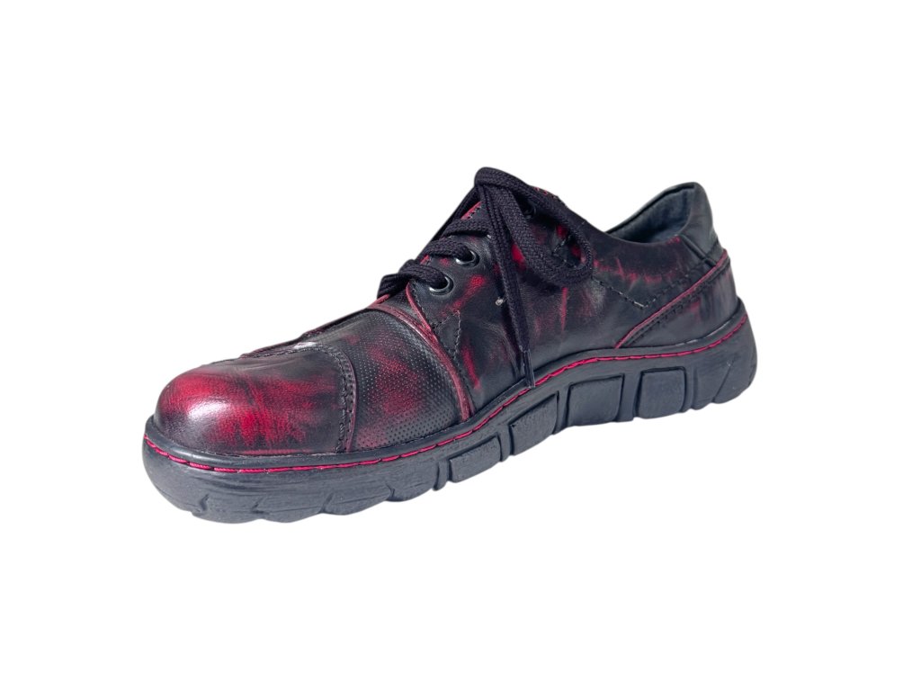 Ručně stíraná kůže v červeno-černém tónu s jemnými červenými akcenty dává každému páru originální charakter.