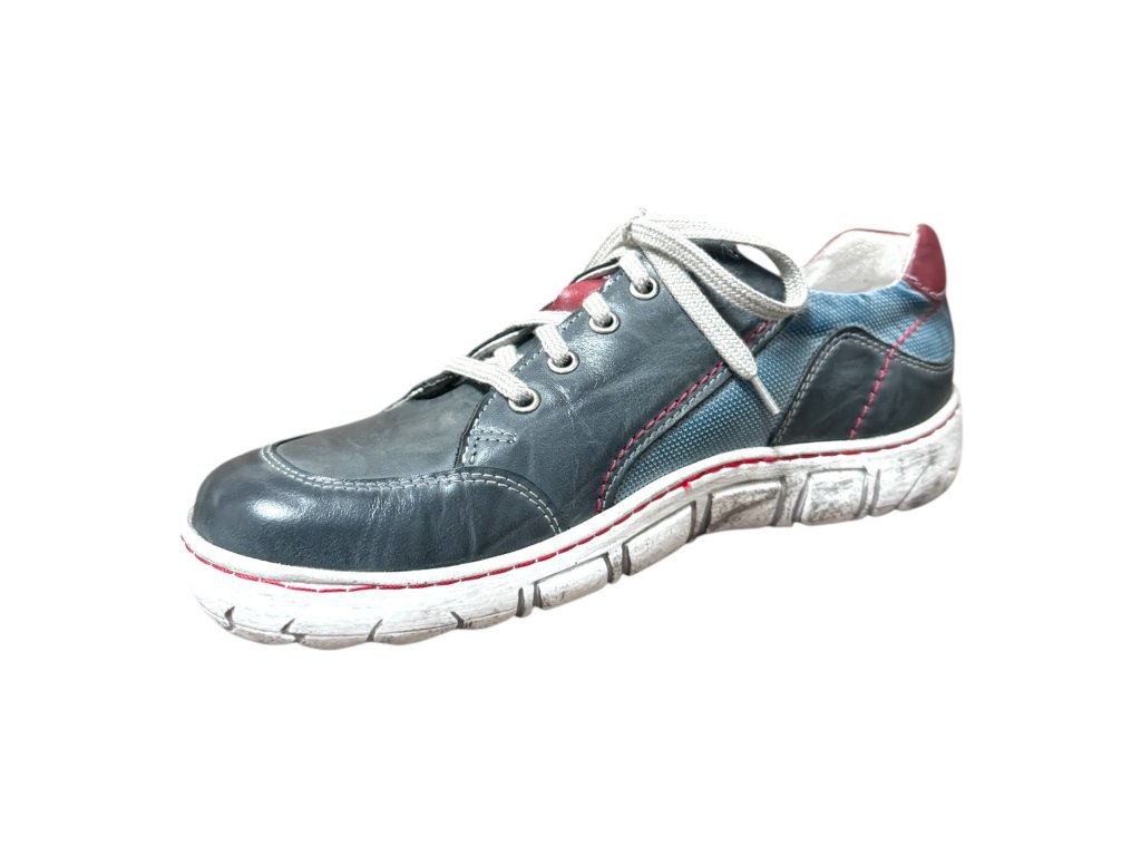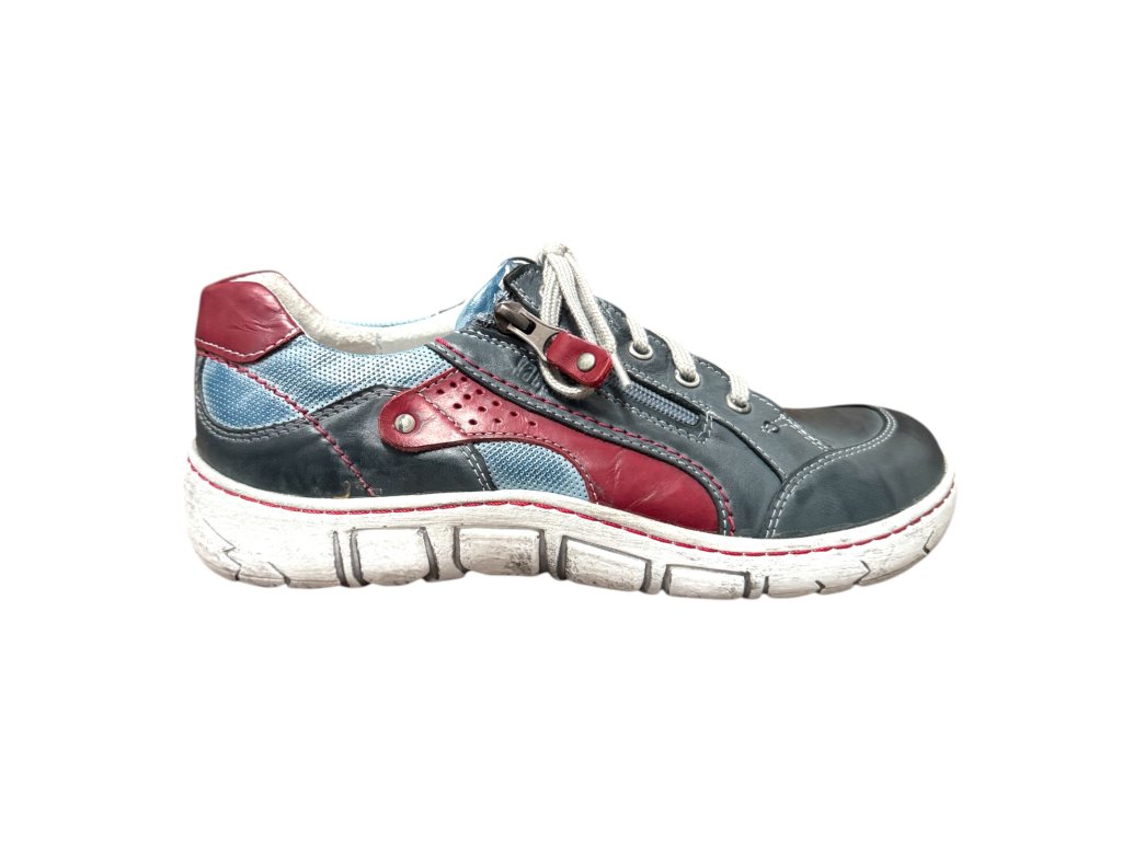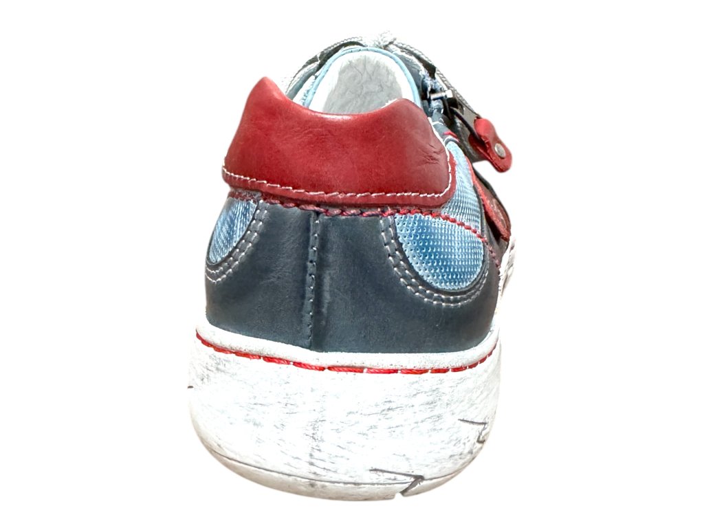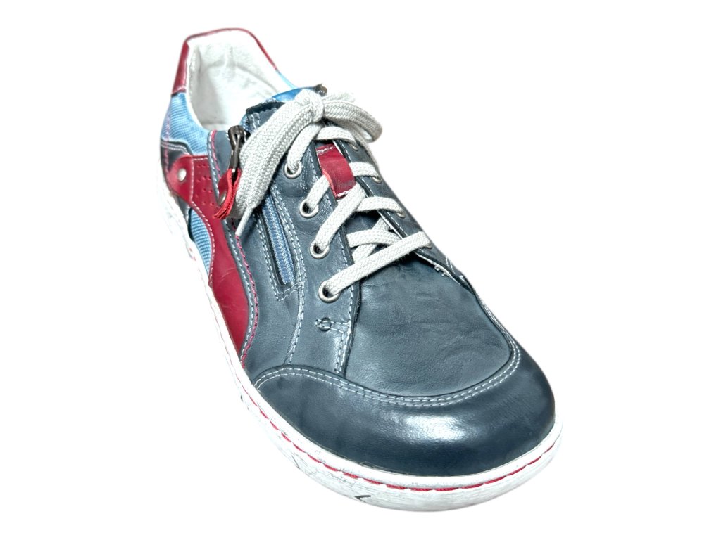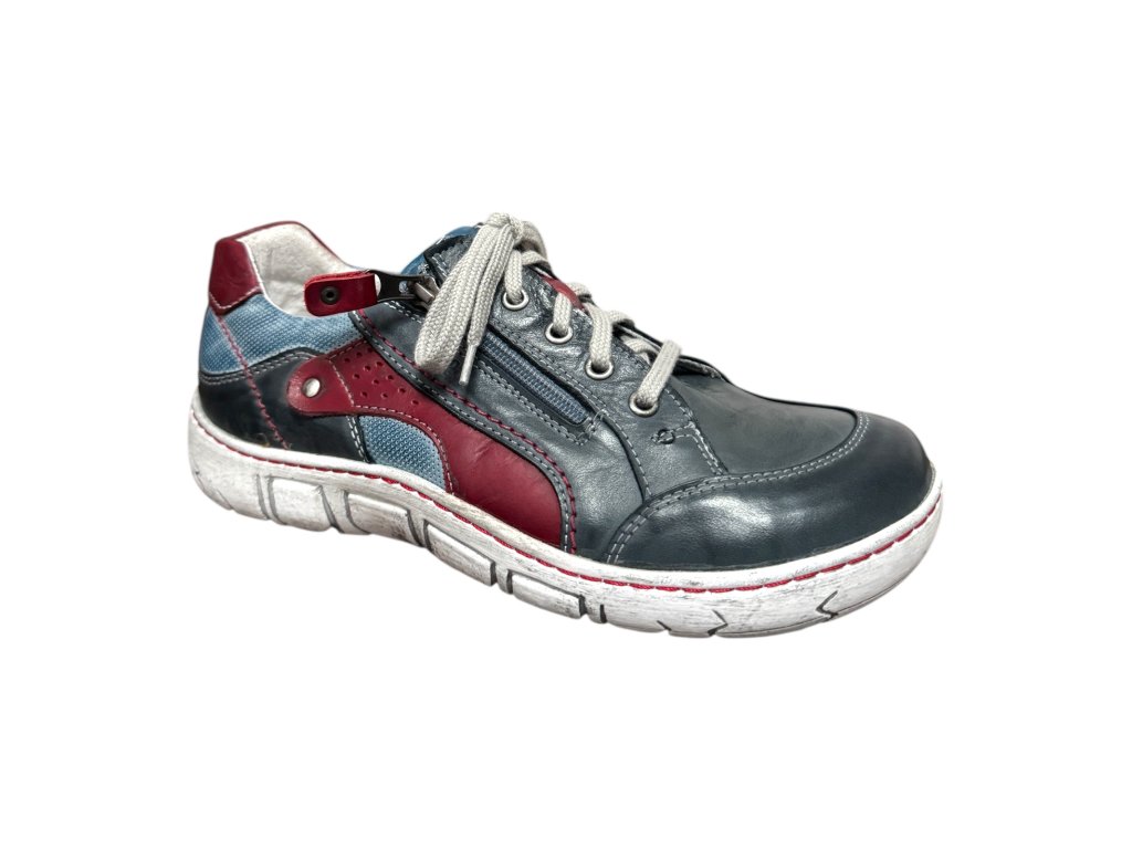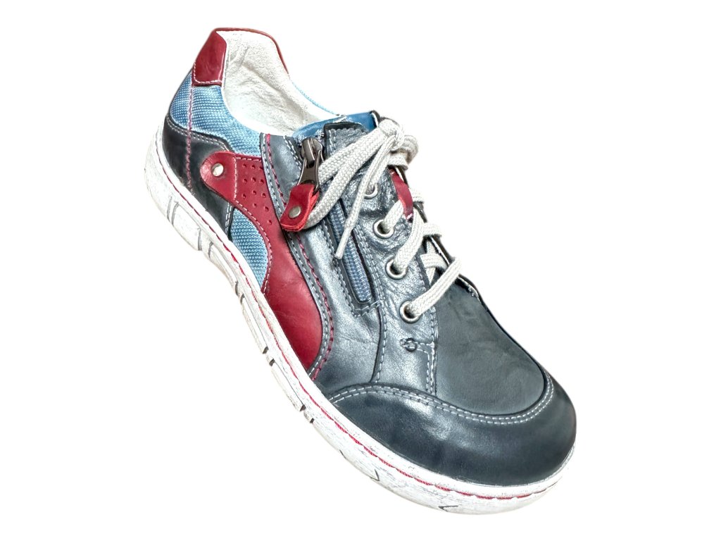 Dámská celoroční obuv značky Kacper zaujme originální kombinací šedé, modré a tmavě červené kůže doplněné o decentní prošívání.