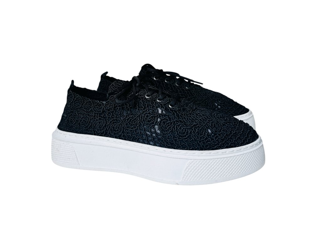 Dámská textilní háčkovaná polobotka Dapi v černé barvě s vyšší pohodlnou podešví a anatomicky tvarovanou stélkou. Lehce vyztužená pata drží nohu jistě, tkaničky umožní přesné dotažení. Ideální volba pro město, dovolenou i celodenní nošení ve svěžím letním stylu.