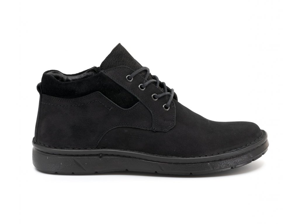 Pánská kožená kotníková obuv zn. Dapi je vyrobena z černé nubukové kůže. Kotníky jsou zateplené textilem s kombinací kůže. Stélka kožená vyměkčená. Jedná se o flexiblovou obuv. Tloušťka podešve 2 až 3 cm pod patou. Výška kotníku 8,5 cm. Model je vhodný pro chodidla typu F-G.>