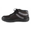 Pánský kotník z tzv. pull up kůže, která je speciálně upravovaná, promaštěná oleji a při běžném používání na sobě zanechává originální patinu. Kotník je v černé barvě s výraznějšími šedými pruhy a špičkou z hladké kůže. Je vysoký 9 cm a uvnitř zateplen fleecem. Obuv je vhodná pro chodidla typu H.