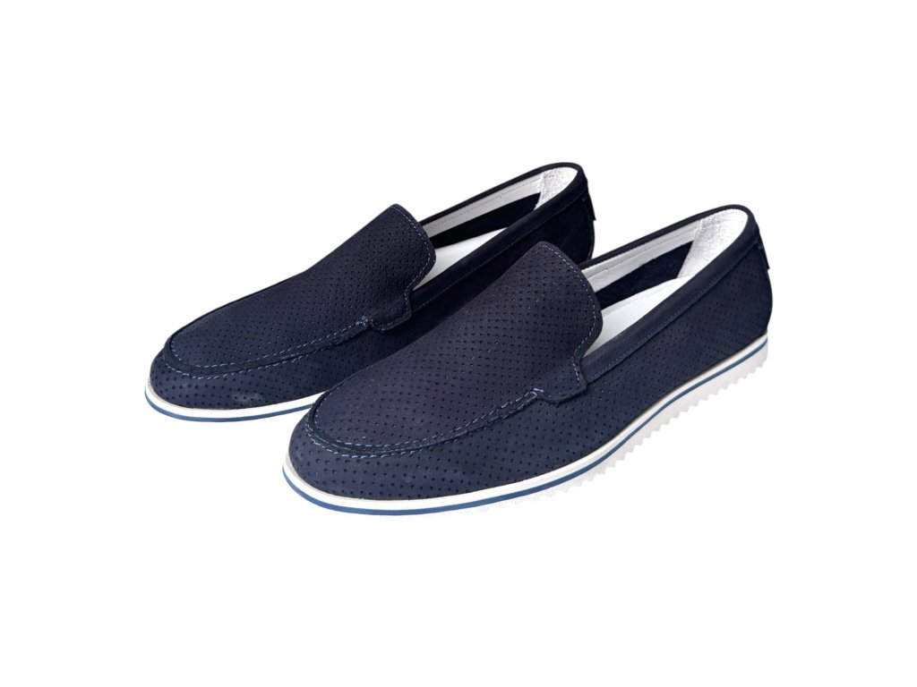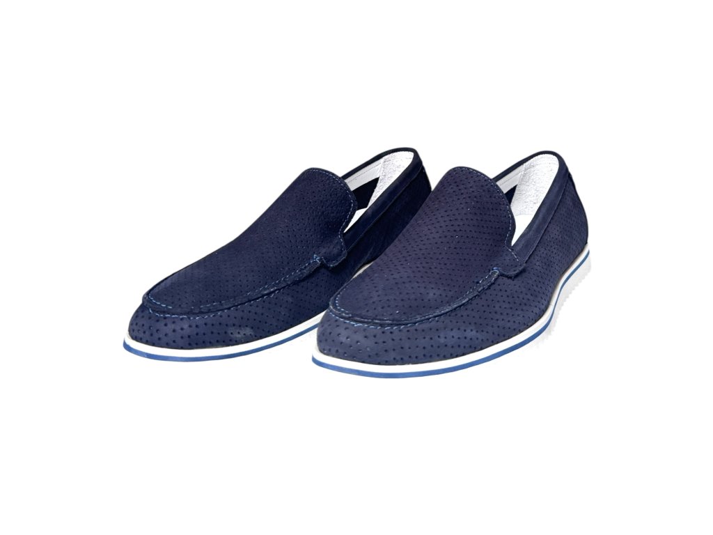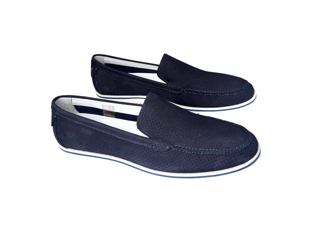 Lehké pánské mokasíny z nubukové kůže s perforací po obvodu pro lepší odvětrání. Vkládací kožená stélka, měkký došlap a odlehčená pěnová podešev – ideální na léto.