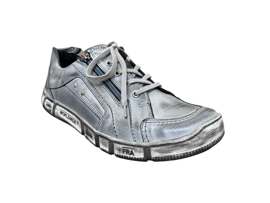 Pánské celoroční zdravotní polobotky Kacper šedá/modrá – typ K (šíře K) pro široké chodidlo a celodenní komfort. Moderní kožený model má módní flexiblovou podešev s designovým efektem, která tlumí došlap a podporuje přirozenou chůzi. Velkou výhodou je zip na nártu: obouvání je rychlé, pohodlné a ocení ho muži s otoky nebo ti, kteří nechtějí stále zavazovat tkaničky. Uvnitř je vyjímatelná kožená stélka, takže můžete vložit i vlastní ortopedickou vložku.